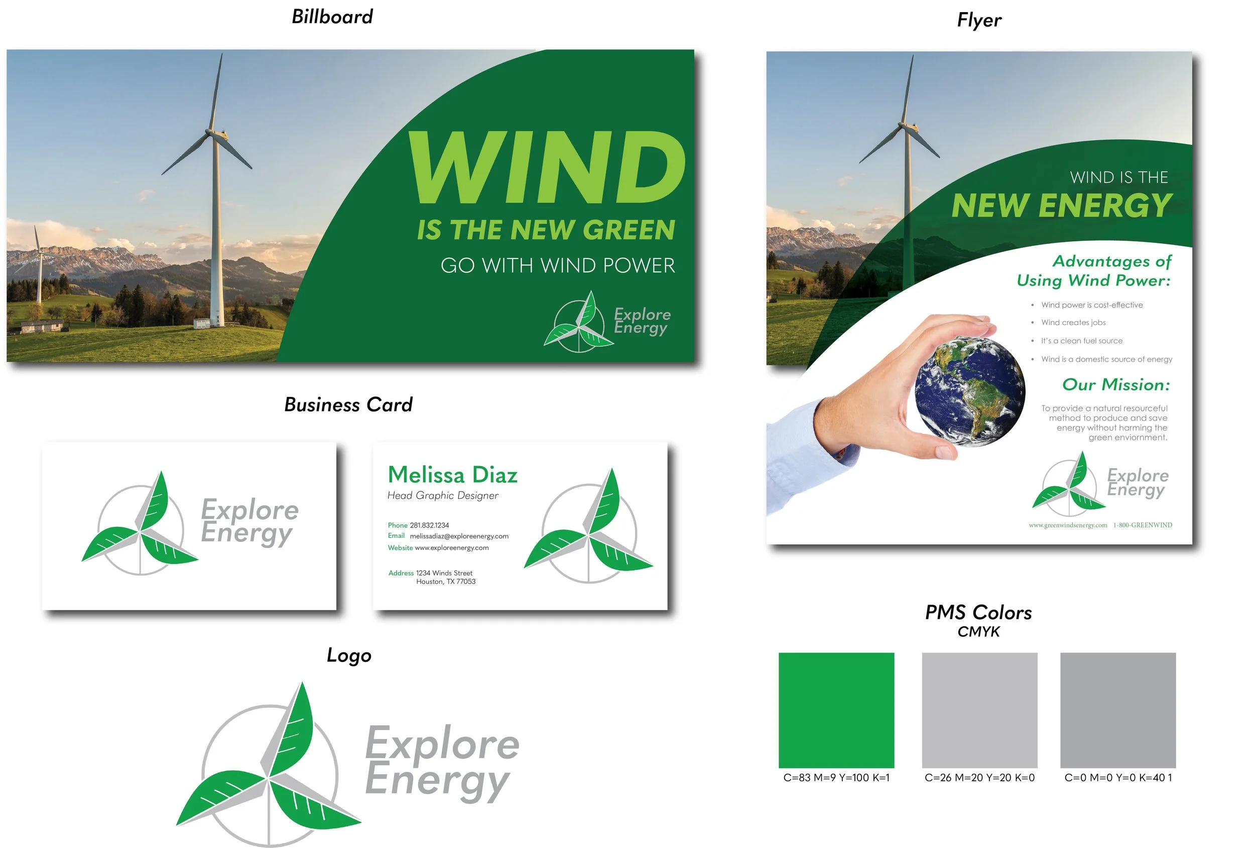 Brand Identity & Logo: I designed a custom logo for Explore Energy that reflects movement and reliability. To ensure professional-grade quality, I personally selected the PMS (Pantone Matching System) colors, allowing for perfect color accuracy across different print and digital platforms. Business Card: I created a professional layout that balances the bold logo with essential contact information, focusing on a clean, modern aesthetic that fits the energy industry. Advertising: I developed a targeted advertisement that utilizes the brand's unique color palette and typography to grab attention and communicate the company’s core message of exploration and power. Technical Focus This project allowed me to demonstrate my skills in color theory, print production, and brand consistency. By managing the process from initial concept to the final PMS selection, I ensured that Explore Energy maintained a cohesive look across all marketing touchpoints.